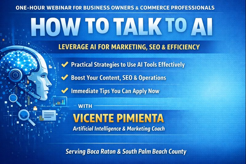Artificial intelligence is no longer a future concept—it’s a powerful business tool when you know how to use it. Join us for a one-hour webinar, How to Talk to AI, designed to help business owners and commerce professionals confidently and effectively use AI tools to support marketing, SEO, content creation, and day-to-day operational efficiency.