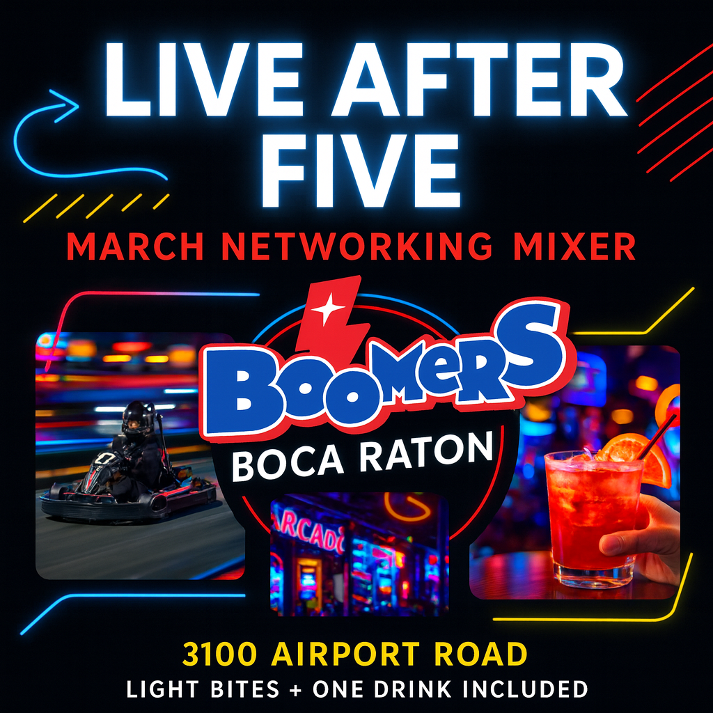 Get ready to mix, mingle, and play at our March Live After Five Networking Mixer—hosted at Boomers Boca Raton, where business meets fun. This high-energy after-hours event brings together professionals from across Boca Raton and South Palm Beach County for meaningful connections in a lively, unforgettable setting.
