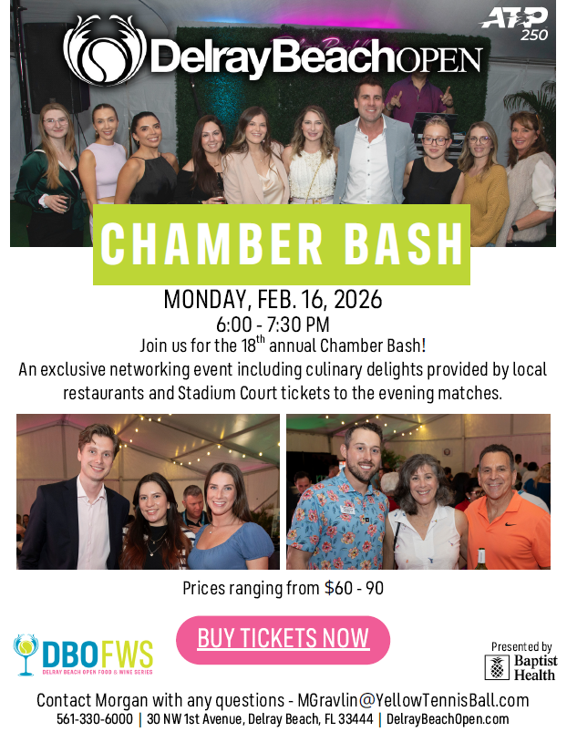 The 18th annual Chamber Bash, an exclusive networking event held in the on-site Hospitality Pavilion including Stadium Court Tickets to the evening’s matches and culinary delights provided by some of the best restaurants in town. The list of participating restaurants and beverages partners coming soon!
